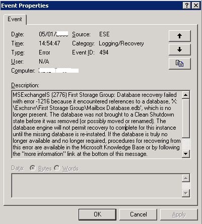 Information Store (3600) First Storage Group: Database recovery failed with error -1216 because it encountered references to a database, {DB_Path}, which is no longer present. The database was not brought to a Clean Shutdown state before it was removed (or possibly moved or renamed). The database engine will not permit recovery to complete for this instance until the missing database is re-instated. If the database is truly no longer available and no longer required, procedures for recovering from this error are available in the Microsoft Knowledge Base or by following the “more information” link at the bottom of this message.